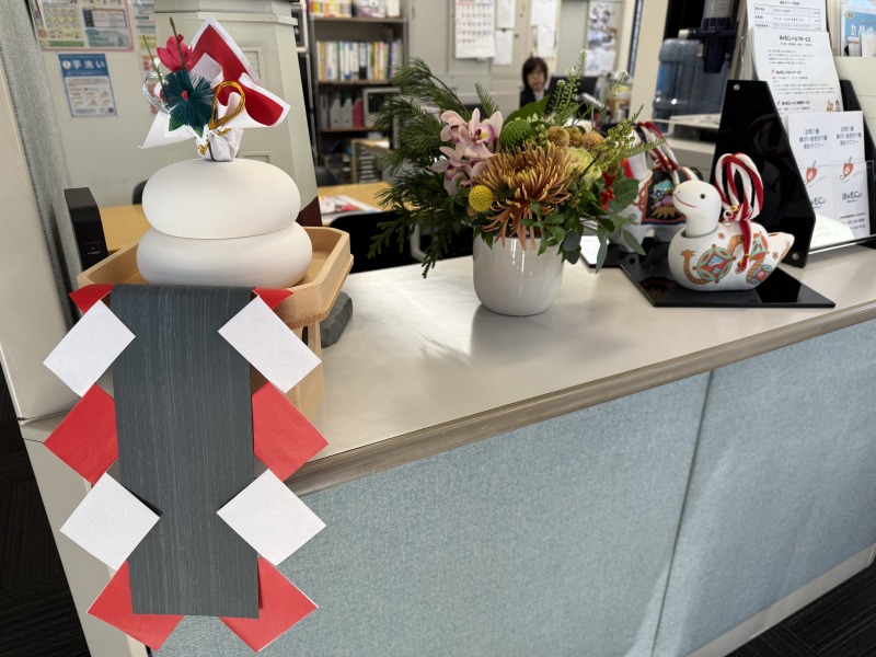 12月27日に例年通り事務所の窓拭き、掃除を行いました。掃除のあとは干支の置物、鏡餅、お正月のお花、正月飾りを設置して準備完了です。